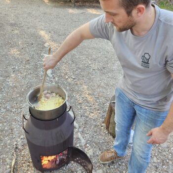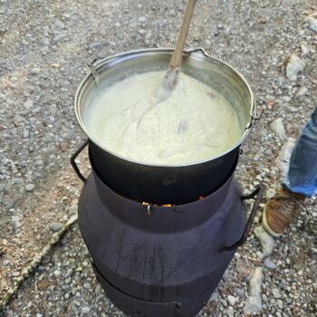 Schon bald nahm DJ P. Rawilic die Turntables in Beschlag und liess eine Playlist erklingen, die selbst die müdesten Landmanne-Schäfchen aus der Reserve lockte. Es rumpelte und rauchte bis der Raketenofen endlich zu brüllen begann. Der Käse wärmte sich, die Mägen auch, und schon bald schwebte eine himmlische Käsemischung über dem Kiesboden wie eine Geschmackswolke, die sich an den Rändern der Gespräche festsetzte und sie mit aromatischen Versprechungen füllte. Versprecher gab es auch.